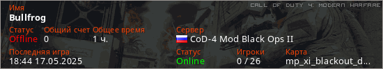 Играет на Call of Duty 4: Modern Warfare сервере. Страна: РоссияПервый раз замечен 16:28 07.01.2025