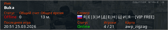 Играет на Counter Strike 1.6 сервере. Страна: РоссияПервый раз замечен 20:49 25.03.2026