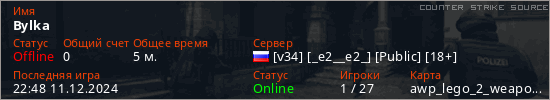 Играет на Counter Strike Source сервере. Страна: РоссияПервый раз замечен 22:11 11.12.2024