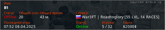Играет на Counter Strike 1.6 сервере. Страна: РоссияПервый раз замечен 20:33 16.05.2022