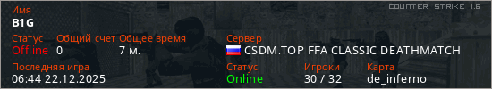 Играет на Counter Strike 1.6 сервере. Страна: РоссияПервый раз замечен 06:01 22.12.2025
