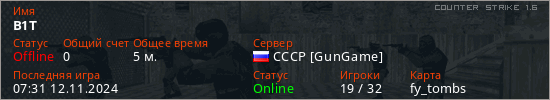 Играет на Counter Strike 1.6 сервере. Страна: РоссияПервый раз замечен 07:29 12.11.2024