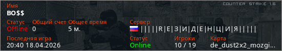 Играет на Counter Strike 1.6 сервере. Страна: РоссияПервый раз замечен 20:36 18.04.2026