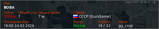 Играет на Counter Strike 1.6 сервере. Страна: РоссияПервый раз замечен 18:54 24.02.2026