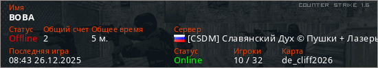 Играет на Counter Strike 1.6 сервере. Страна: РоссияПервый раз замечен 08:32 26.12.2025