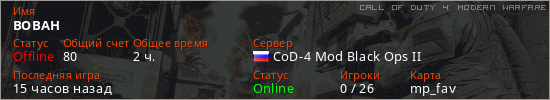 Играет на Call of Duty 4: Modern Warfare сервере. Страна: РоссияПервый раз замечен 21:57 13.05.2024