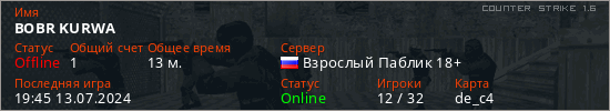 Играет на Counter Strike 1.6 сервере. Страна: РоссияПервый раз замечен 23:03 08.05.2024