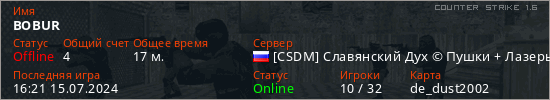 Играет на Counter Strike 1.6 сервере. Страна: РоссияПервый раз замечен 15:49 30.05.2024