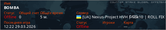 Играет на Counter Strike Global Offensive сервере. Страна: УкраинаПервый раз замечен 12:09 29.03.2026