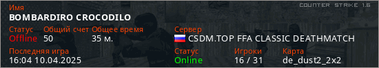 Играет на Counter Strike 1.6 сервере. Страна: РоссияПервый раз замечен 16:21 24.03.2025