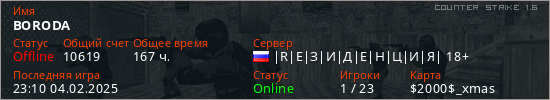 Последний раз был в сети 23:10 04.02.2025 Игрок с таким ником замечен на 29 серверах