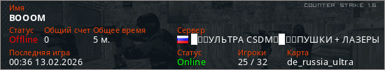 Играет на Counter Strike 1.6 сервере. Страна: РоссияПервый раз замечен 00:33 13.02.2026