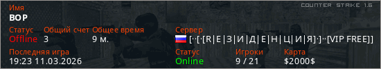 Играет на Counter Strike 1.6 сервере. Страна: РоссияПервый раз замечен 19:47 10.03.2026