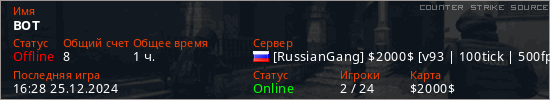 Играет на Counter Strike Source сервере. Страна: РоссияПервый раз замечен 19:32 07.07.2023