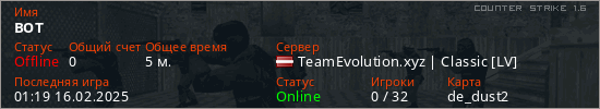 Играет на Counter Strike 1.6 сервере. Страна: ЛатвияПервый раз замечен 01:14 16.02.2025