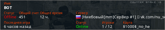 Играет на Counter Strike 1.6 сервере. Страна: РоссияПервый раз замечен 18:51 16.09.2021