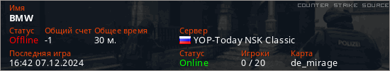 Играет на Counter Strike Source сервере. Страна: РоссияПервый раз замечен 22:58 27.01.2023
