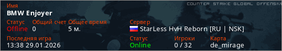 Играет на Counter Strike Global Offensive сервере. Страна: РоссияПервый раз замечен 13:36 29.01.2026