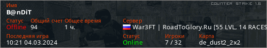 Играет на Counter Strike 1.6 сервере. Страна: РоссияПервый раз замечен 11:41 15.02.2024