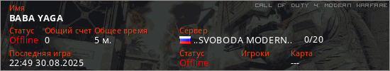 Играет на Call of Duty 4: Modern Warfare сервере. Страна: РоссияПервый раз замечен 22:14 30.08.2025