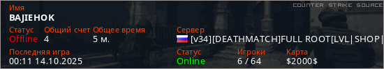 Играет на Counter Strike Source сервере. Страна: РоссияПервый раз замечен 23:50 13.10.2025