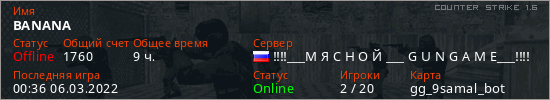 Играет на Counter Strike 1.6 сервере. Страна: РоссияПервый раз замечен 23:47 26.02.2022