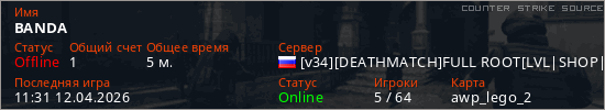 Играет на Counter Strike Source сервере. Страна: РоссияПервый раз замечен 10:29 12.04.2026