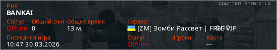 Играет на Counter Strike 1.6 сервере. Страна: УкраинаПервый раз замечен 13:59 29.03.2026