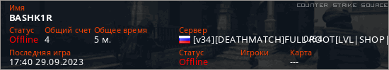 Играет на Counter Strike Source сервере. Страна: РоссияПервый раз замечен 17:07 29.09.2023