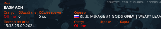 Играет на Counter Strike Global Offensive сервере. Страна: РоссияПервый раз замечен 15:36 25.09.2024