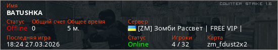 Играет на Counter Strike 1.6 сервере. Страна: УкраинаПервый раз замечен 18:17 27.03.2026