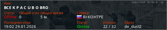 Играет на Counter Strike 1.6 сервере. Страна: РоссияПервый раз замечен 18:58 29.01.2026