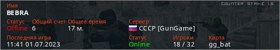 Играет на Counter Strike 1.6 сервере. Страна: РоссияПервый раз замечен 12:56 28.06.2023