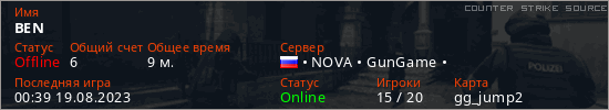 Играет на Counter Strike Source сервере. Страна: РоссияПервый раз замечен 13:56 17.08.2023