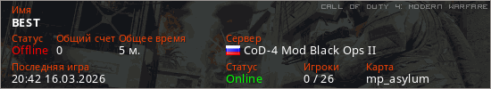Играет на Call of Duty 4: Modern Warfare сервере. Страна: РоссияПервый раз замечен 20:37 16.03.2026