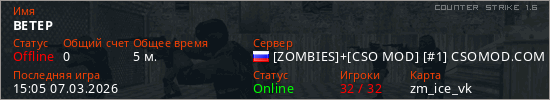 Играет на Counter Strike 1.6 сервере. Страна: РоссияПервый раз замечен 15:03 07.03.2026