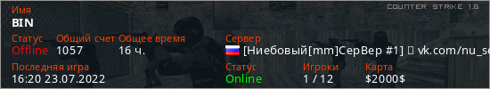 Играет на Counter Strike 1.6 сервере. Страна: РоссияПервый раз замечен 18:44 28.10.2021