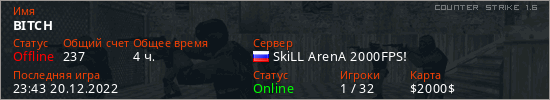 Играет на Counter Strike 1.6 сервере. Страна: РоссияПервый раз замечен 19:07 12.07.2022