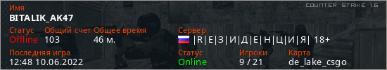 Играет на Counter Strike 1.6 сервере. Страна: РоссияПервый раз замечен 22:17 13.05.2022