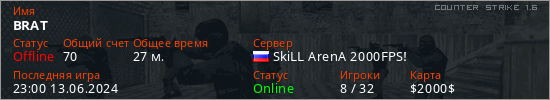 Играет на Counter Strike 1.6 сервере. Страна: РоссияПервый раз замечен 18:25 01.03.2023