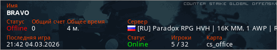 Играет на Counter Strike Global Offensive сервере. Страна: РоссияПервый раз замечен 21:40 04.03.2026