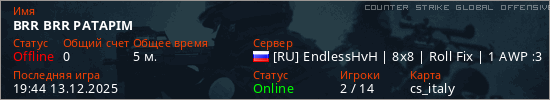 Играет на Counter Strike Global Offensive сервере. Страна: РоссияПервый раз замечен 19:34 13.12.2025