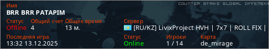 Играет на Counter Strike Global Offensive сервере. Страна: КазахстанПервый раз замечен 20:34 12.12.2025
