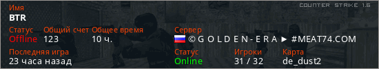 Играет на Counter Strike 1.6 сервере. Страна: РоссияПервый раз замечен 08:24 17.06.2023