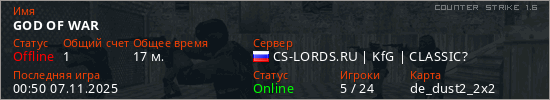 Играет на Counter Strike 1.6 сервере. Страна: РоссияПервый раз замечен 19:48 10.01.2025