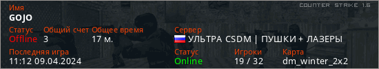 Играет на Counter Strike 1.6 сервере. Страна: РоссияПервый раз замечен 18:25 19.02.2024
