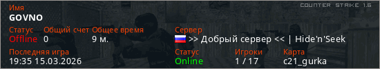 Играет на Counter Strike 1.6 сервере. Страна: РоссияПервый раз замечен 16:52 13.03.2026