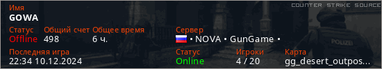 Играет на Counter Strike Source сервере. Страна: РоссияПервый раз замечен 11:38 04.10.2024