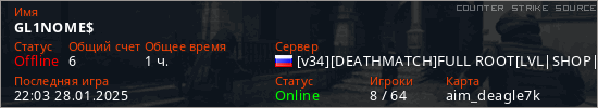 Играет на Counter Strike Source сервере. Страна: РоссияПервый раз замечен 14:48 19.01.2025