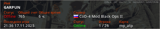Играет на Call of Duty 4: Modern Warfare сервере. Страна: РоссияПервый раз замечен 19:29 22.09.2024
